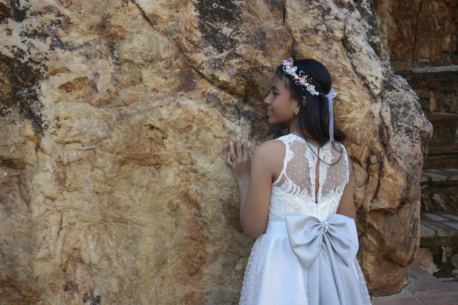 Nuestros vestidos están confeccionados artesanalmente con tejidos de alta calidad y acabados impecables. Diseñamos piezas elegantes, cómodas y atemporales que realzan la belleza natural de cada niña o mujer en su gran día.